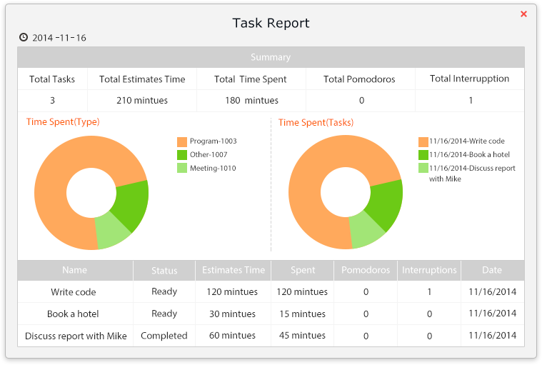 Reports can also be generated, displaying the total number of activities you have programmed, total estimated time and the time you spent on each of them.