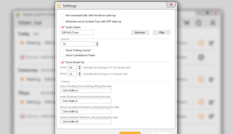 It can run on startup, activate audio alerts on events, adjust window opacity, enable clock ticking sound or show countdown timer, customize break intervals or keyboard shortcuts for actions like showing/hiding desktop icons or unrelated windows.